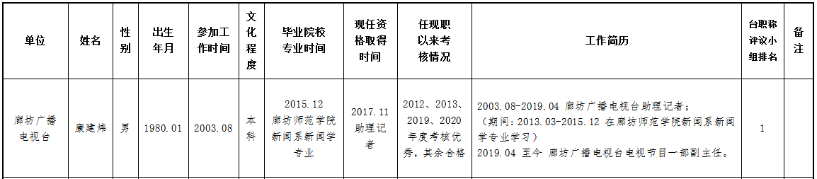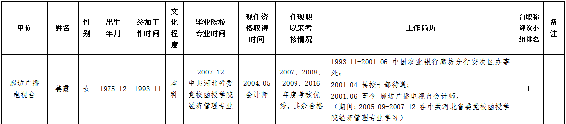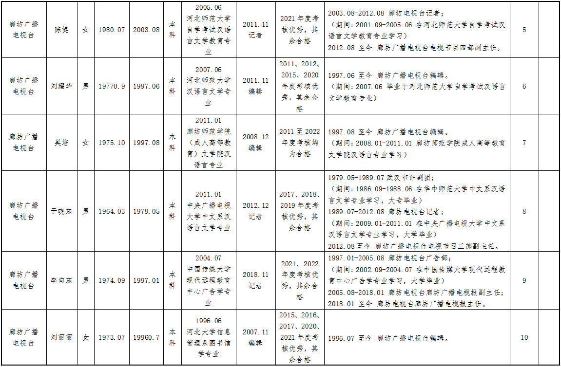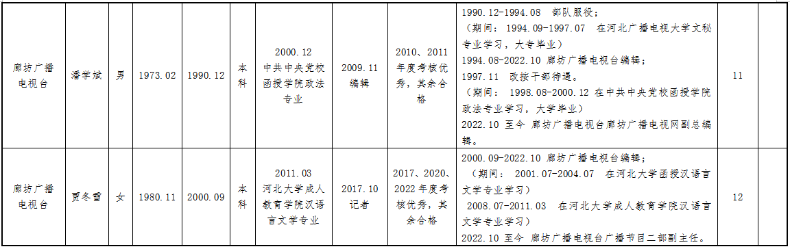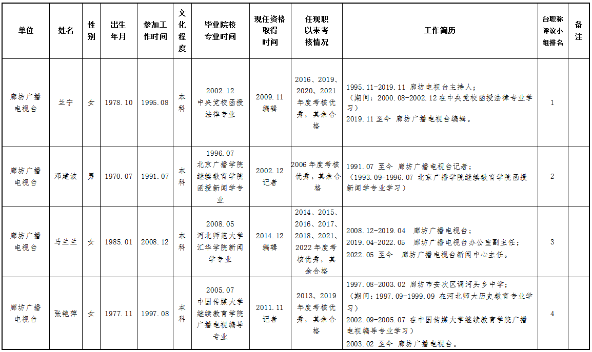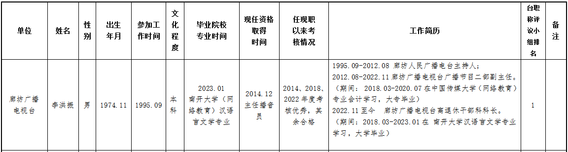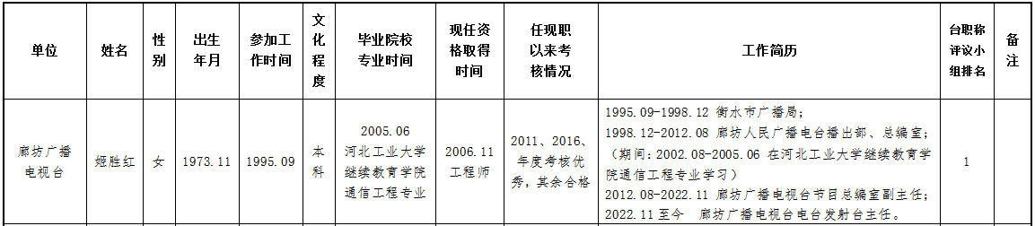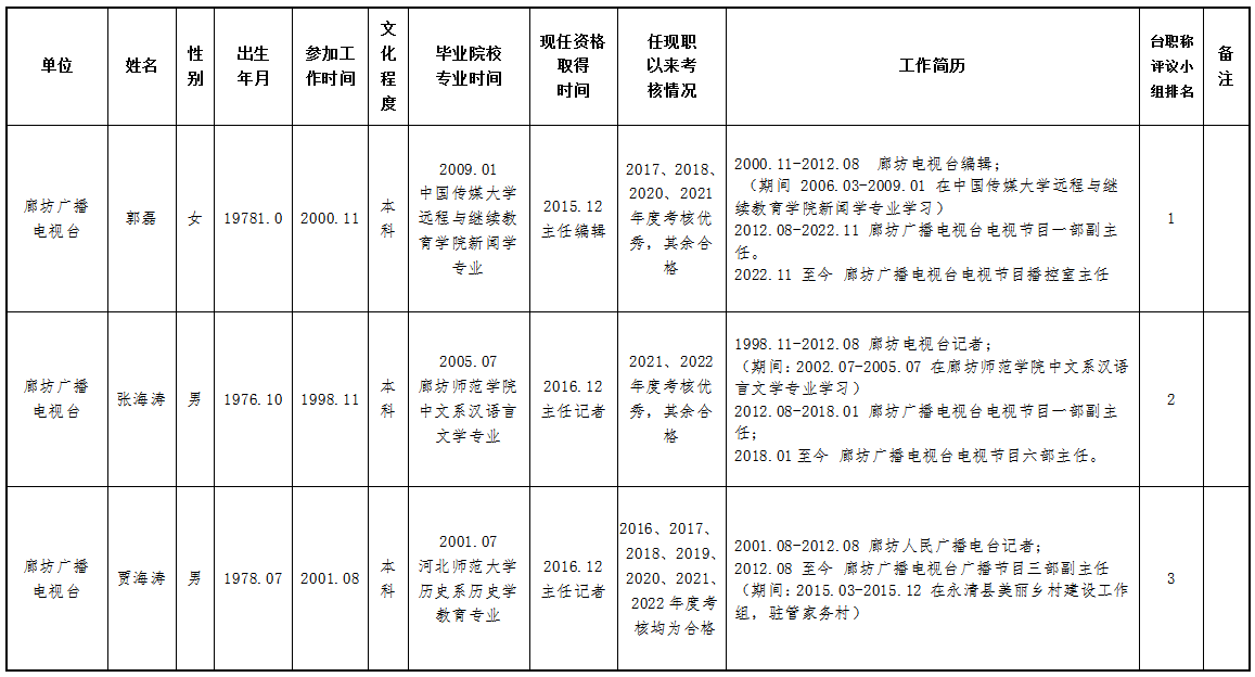 现将2023年度推荐申报正高、副高、中级专业技术职务任职资格人员情况公示如下,公示期为2023年8月10日—2023年8月16日,如有异议,请与廊坊广播电视台人力资源中心联系。联系人:付建东、贾昌,联系电话:0316-2311314。