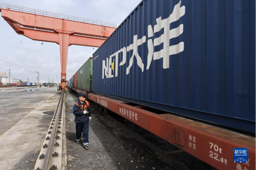 4月28日,班列驶出廊坊北铁路货场。新华社发(刘向摄)