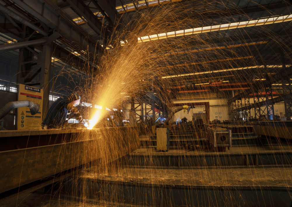 “五一”假期,位于河北廊坊的中建二局安装工程有限公司廊坊钢结构制造厂的8条重钢生产线上,焊枪迸发的火花照亮了工人勤奋工作的脸庞。