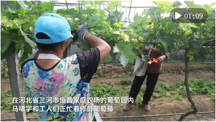 在河北省三河市恒昌家庭农场的葡萄园内,马啸宇和工人们正忙着修剪葡萄藤。2015年,马啸宇毕业于华中农业大学动物医学专业,他放弃了培训讲师的工作回乡创业,进行葡萄种植。经过8年努力,马啸宇已成为一名爱农业、懂技术、善经营的新农人。如今,他的葡萄园年收入能达到50余万元,还有效带动了30余名周边村民就近就业。
