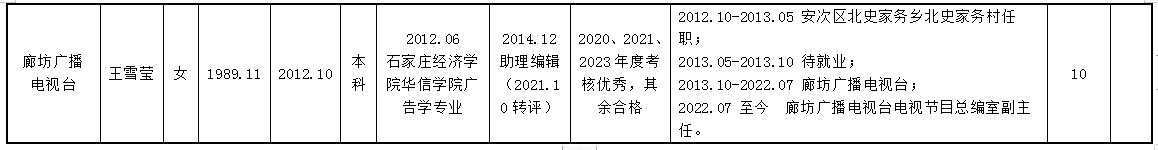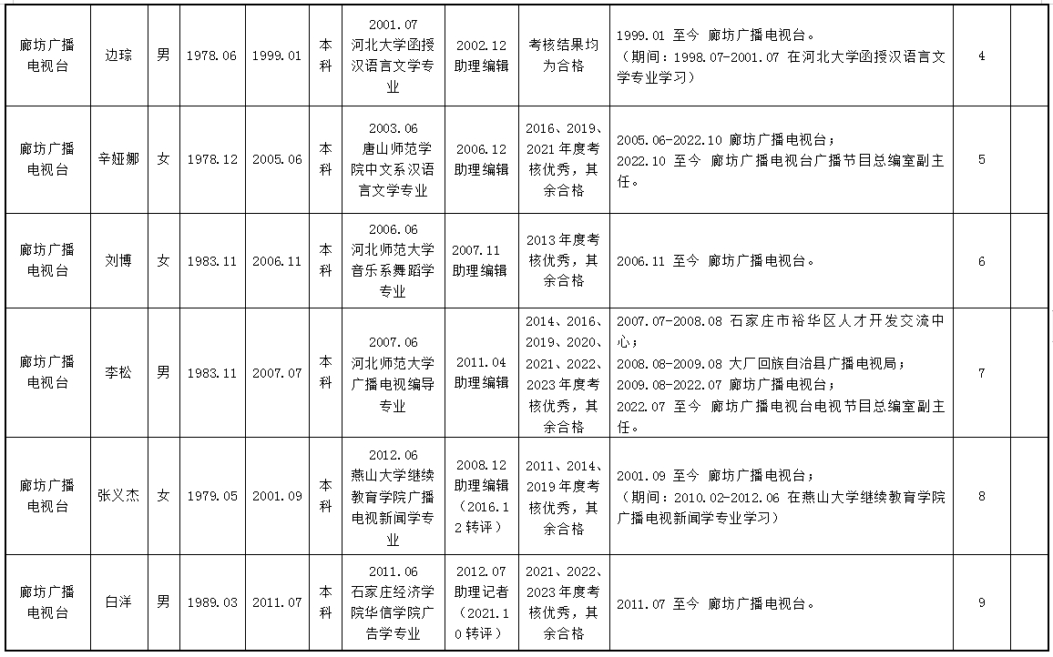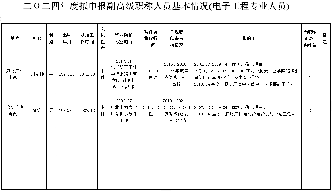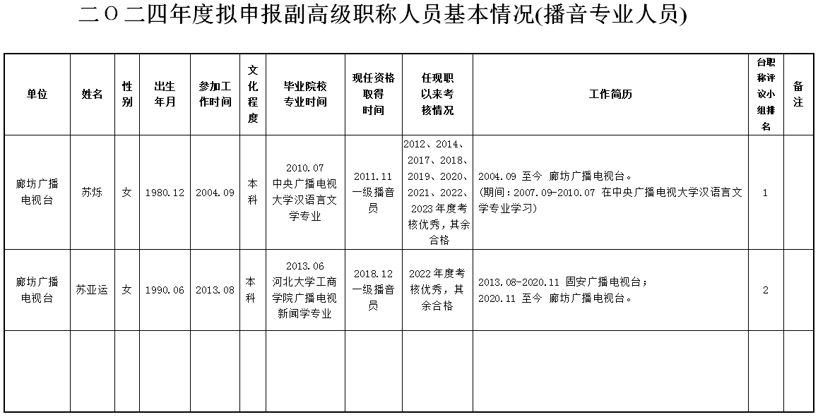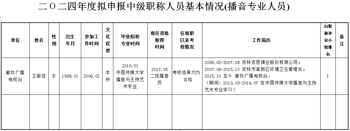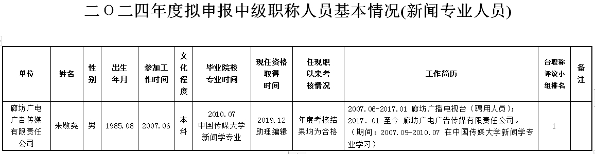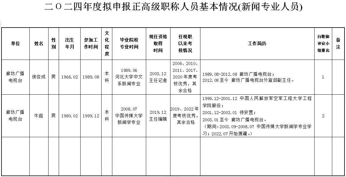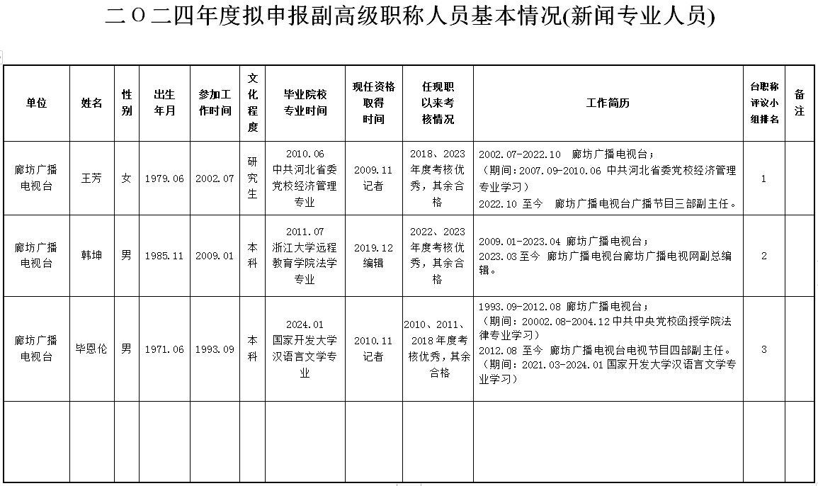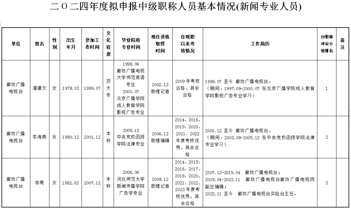 现将2024年度推荐申报正高、副高、中级专业技术职务任职资格人员情况公示如下,公示期为2024年7月17日—2024年7月23日,如有异议,请与廊坊广播电视台人力资源中心联系。联系人:马兰兰、付建东,联系电话:0316-2311314。