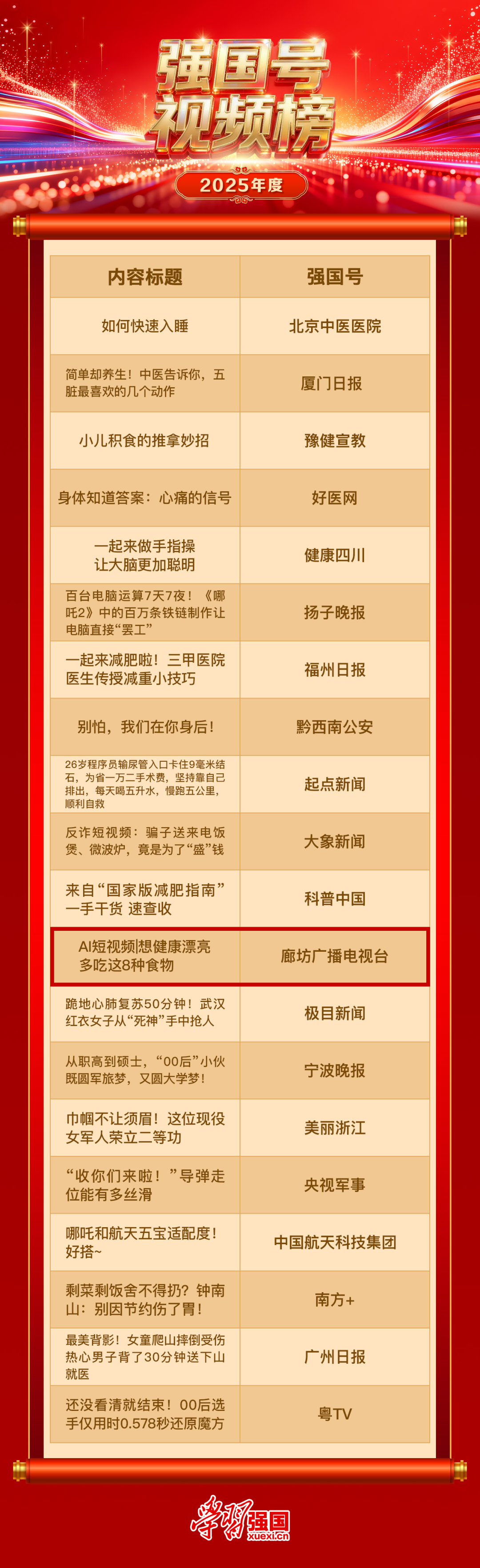 由廊坊广播电视台融媒体中心制作、“廊坊广播电视台”强国号推送的《AI短视频丨想健康漂亮多吃这8种食物》,从全国1100余家强国号推荐的作品中脱颖而出,荣登强国号“视频榜”榜单,廊坊广播电视台也成为我省唯一入选四大榜单的地市级媒体。