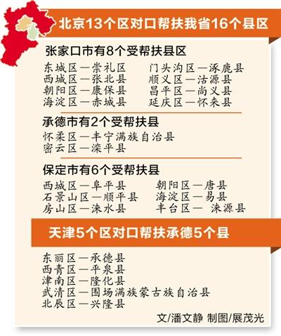 河北新闻网讯(河北日报记者潘文静)从省发改委获悉,为推动落实京津冀协同发展重大国家战略,按照《关于进一步加强东西部扶贫协作工作的指导意见》《京津两市对口帮扶河北省张承环京津相关地区工作方案》要求,2016年至2020年,北京市、天津市对我省张家口市、承德市、保定市相关县区开展对口帮扶。其中,北京市13个区对口帮扶张承保三市16个县区,天津市5个区对口帮扶承德市5个县。