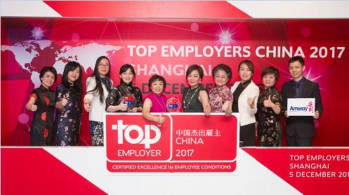 2016年12月5日,知名独立第三方调研机构杰出雇主调研机构(Top Employers Institute)在上海举行颁奖典礼,安利(中国)、联合利华、惠氏、百事食品、上汽大众等69家企业获得“2017中国杰出雇主”。安利(中国)连续第八年获得 “中国杰出雇主认证”,并首次荣膺“中国杰出雇主Top 10”,同时也第二次获得“亚太区杰出雇主认证”的殊荣。