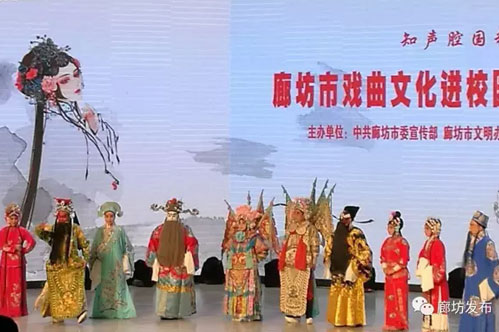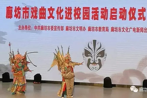 近年来,廊坊市高度重视优秀传统文化的传承和弘扬。组织开展了“传统文化进校园”活动,将国学诵读、书法艺术、戏曲文化、非遗文化等作为传统文化进校园的重要内容。此次活动既是贯彻全省戏曲文化进校园的具体举措,也是弘扬传统文化的重要途径。