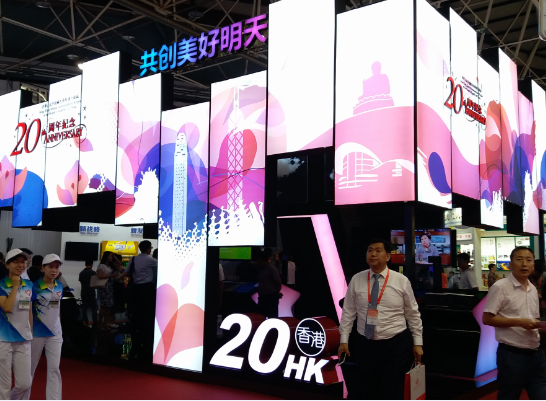 在香港展区,一堵精致的动漫墙吸引了记者,上面用紫荆花、维多利亚港湾、国旗、喇叭等很多关键元素阐释了“庆祝香港特别行政区回归20周年”这个主题,只要用手轻轻触碰这些关键元素,它们马上就活了起来,青蛙会叫,小鱼会游,紫荆花慢慢开放……一幅香港时尚、现代的画卷展现在眼前。