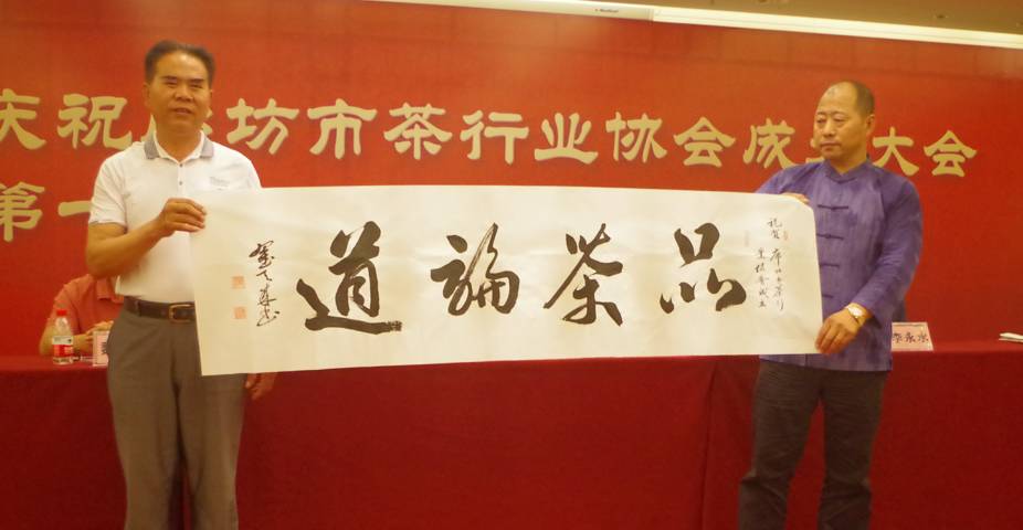 廊坊师范学院国画教授张俊平先生和河北省书法家协会会员翟天来老师为庆贺廊坊市茶行业协会成立分别为协会赠与了国画与书法作品。