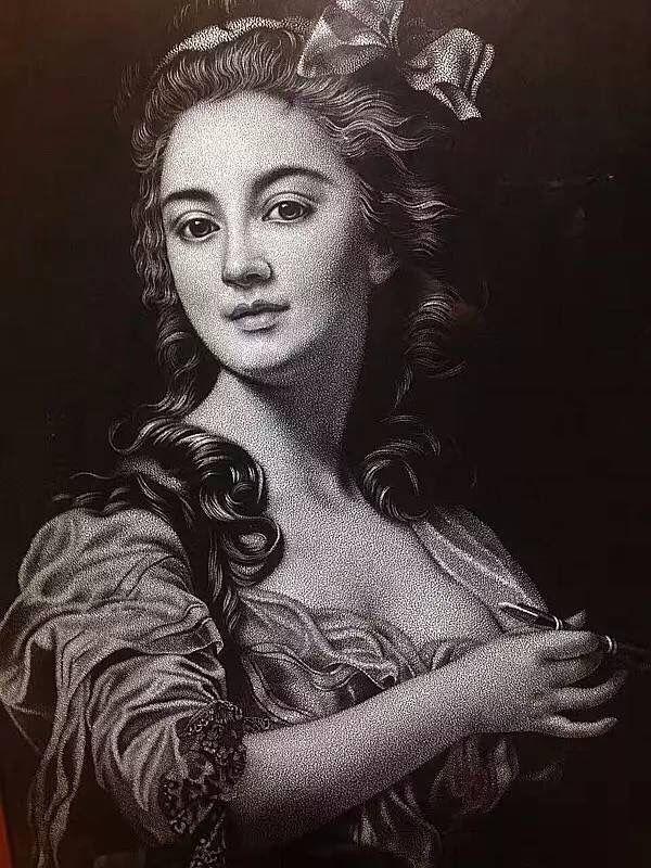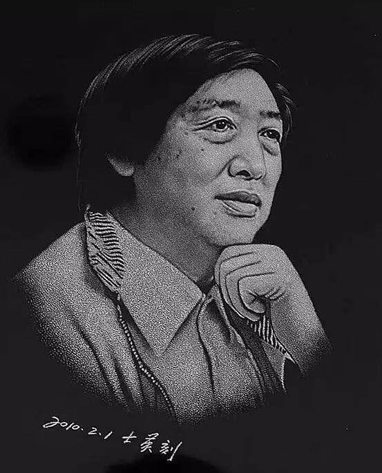 她说,人物的面部表情和立体感是靠黑白灰来体现,黑白灰是靠手腕上的力度来掌握,力度的大小要用心和眼睛来控制,必须心手合一,恰到好处。每次做人物眼睛时必须全神贯注甚至是高度紧张,每个细节都必须是一气呵成。稍有一丁点儿不慎,就严重影响了人物的面目表情,一旦出错便无法修补。