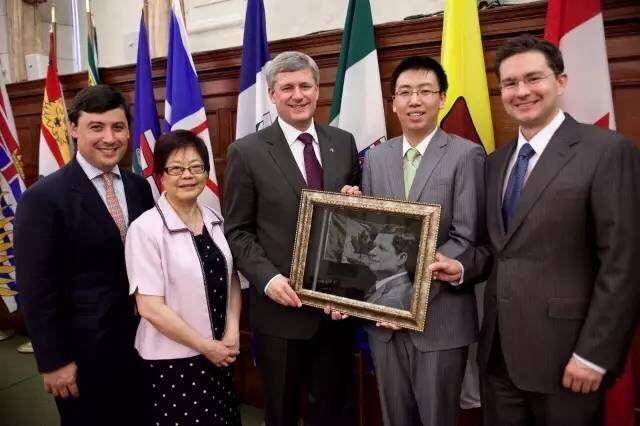 ▲加拿大前总理哈珀(左三)与自己影雕画像的合影