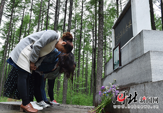 一位长春的游客听完导游讲述王尚海的故事后,在王尚海纪念林碑前鞠躬献花,表达崇敬之情。 记者贾恒 霍艳恩摄