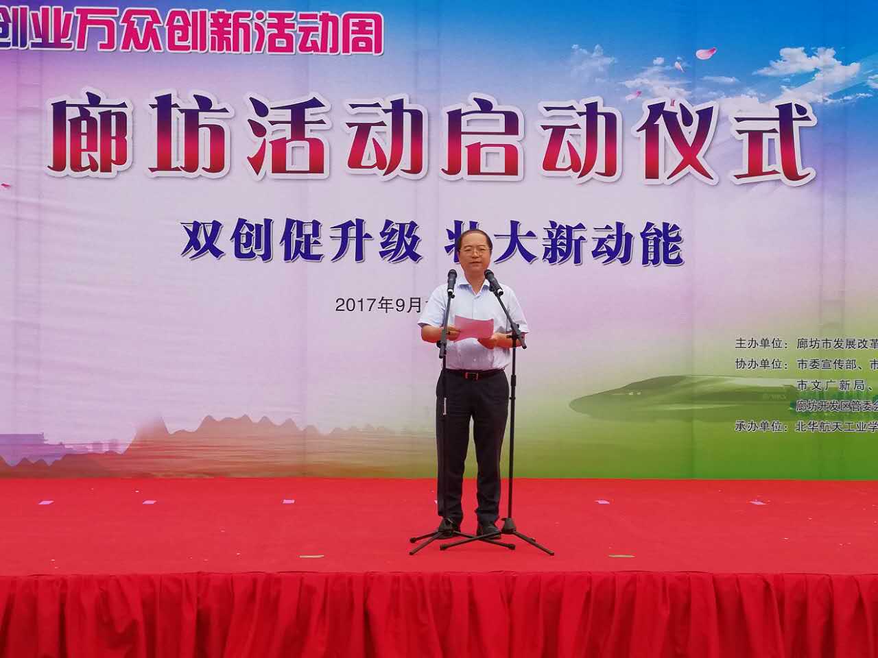 9月16日,2017年全国大众创业万众创新活动周廊坊活动在北华航天工业学院正式启动。市委常委、常务副市长贾永清出席启动仪式并讲话,中国工程院院士赵文津应邀出席启动仪式。