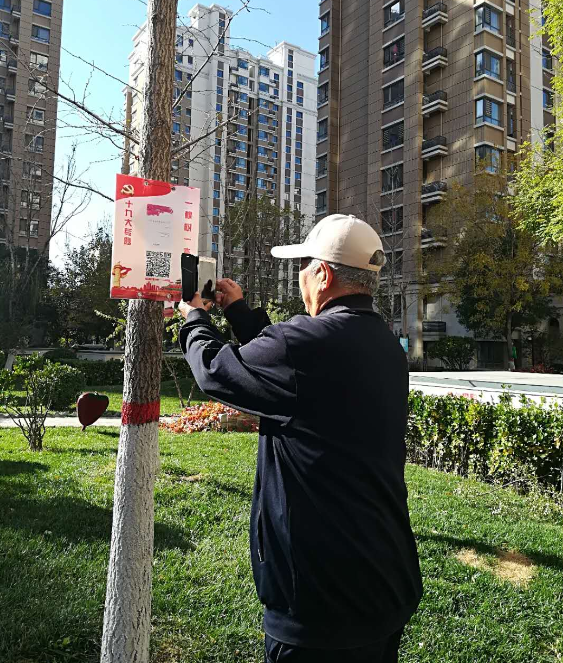今年68岁的曹国友是一名有着40多年党龄的老党员,也是一名紧跟科技时代的老人,看到社区树干上所挂的十九大专题读书牌,曹国友随手拿出手机,熟练的扫码,进行阅读。