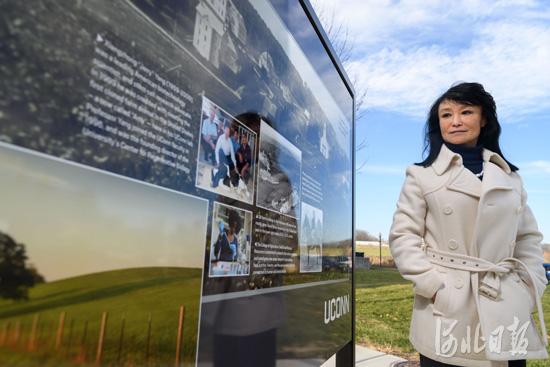 杨向中的妻子田秀春在康州大学校内关于杨向中的宣传牌前伫立。