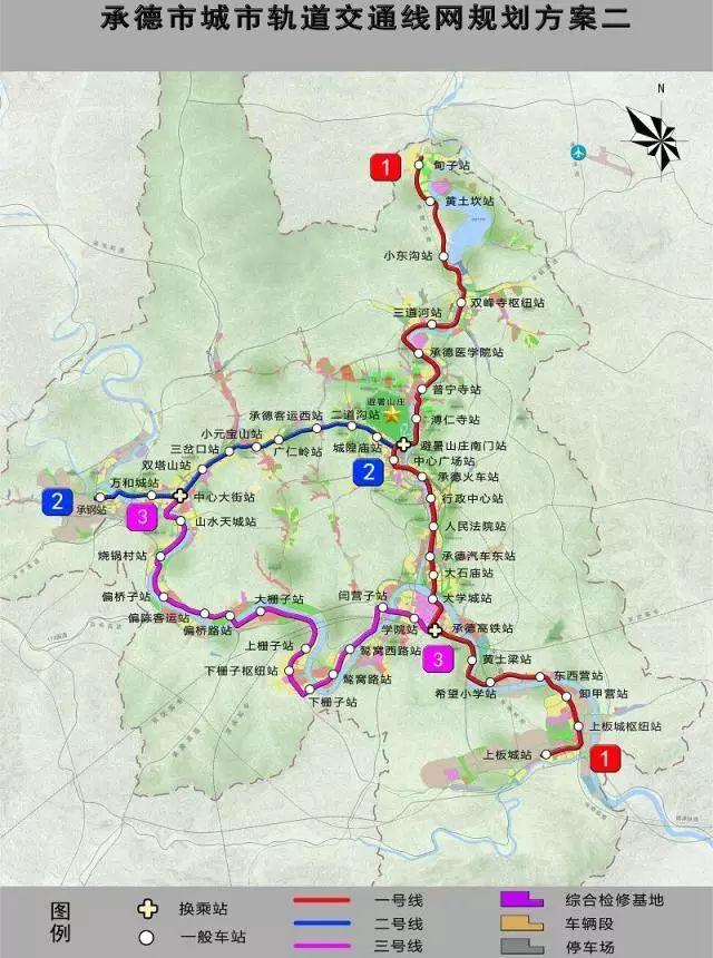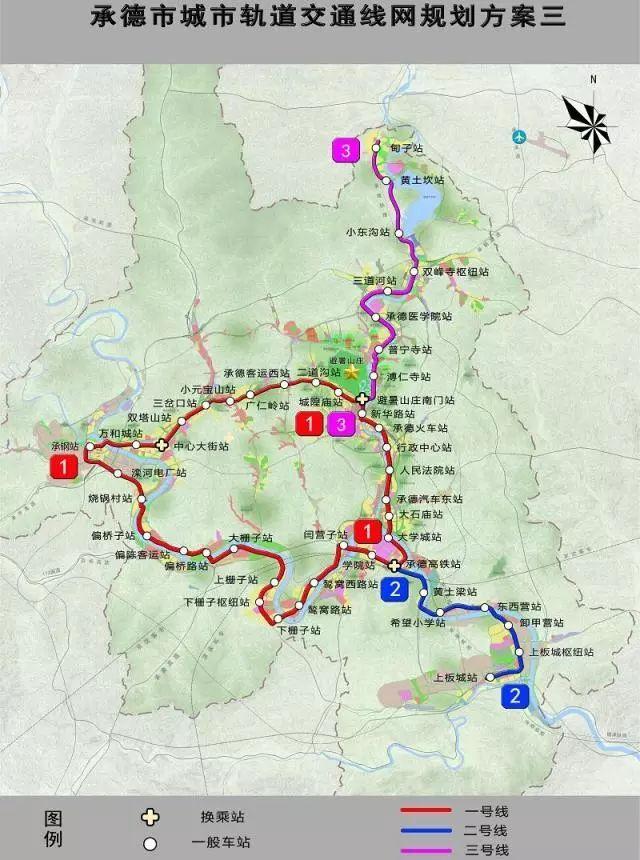 由3条线组成,线路间相互搭接,组合成环状。1号线主要衔接上板城组团、老城区、西区组团客流、武烈河沿岸发展带。2号线主要衔接老城区和北部新城。3号线主要沿滦河沿岸发展带敷设。