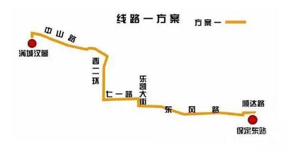 其中,1号线为保定东站始发,途径顺达路、聚贤街、东风路、乐凯大街、七一路、西二环,再经由满城区中山路,终点为满城汉墓 。