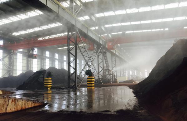 河北永洋特钢集团料棚内的喷洒除尘装置正在作业