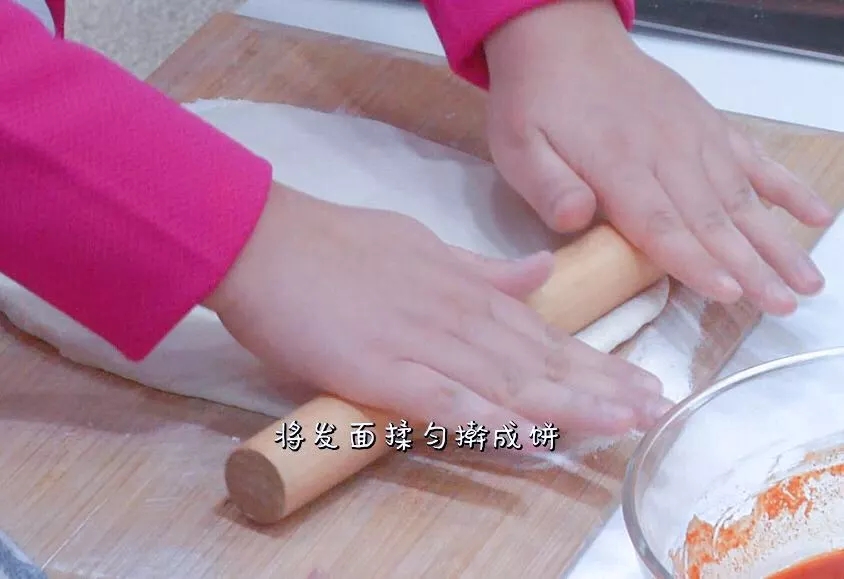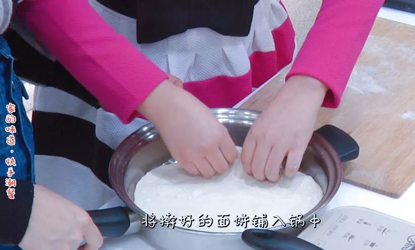 面饼铺入锅中,用餐叉在面饼上扎孔