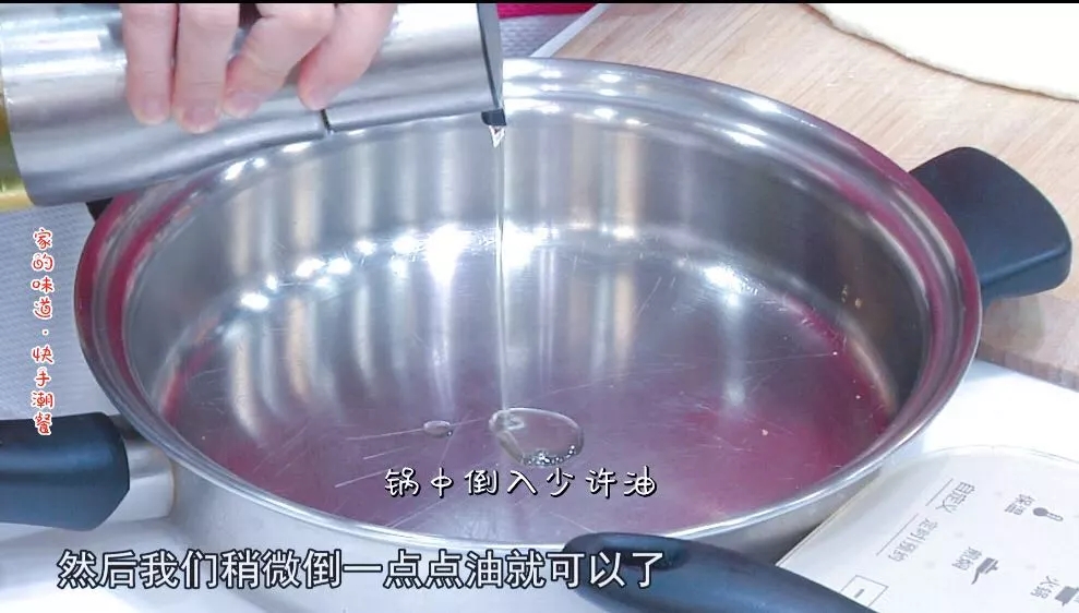 锅中倒入少许油。安利皇后锅特有的低温免水煮食法,用极少的油就能烹饪出美味的菜肴。