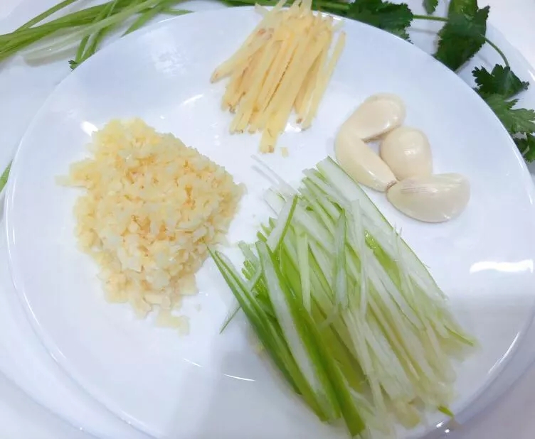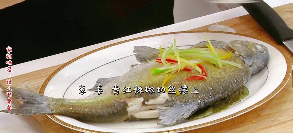 2/将葱、姜、青红辣椒丝摆上,倒入蒸鱼豉油即可