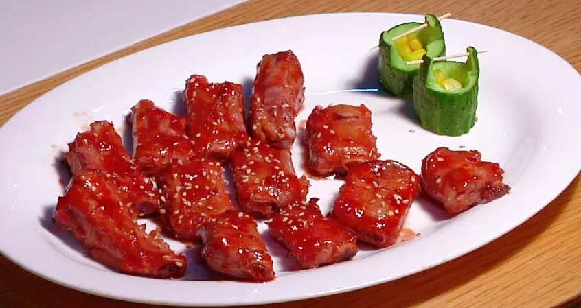 色泽鲜艳且软嫩多汁的叉烧排骨就上桌了~