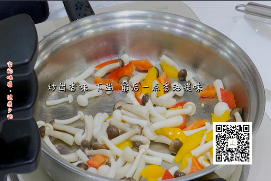 2、安利皇后锅特有的低温免水煮食法,用极少的油就能烹饪出美味的菜肴,所以锅内只需倒入少许油,然后将彩椒炒香,倒入焯过的蘑菇,炒出香味,撒盐、倒入香油提味,即可出锅。