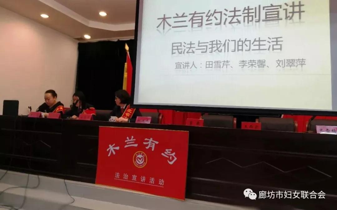 3月1日,廊坊市“木兰有约”法治宣讲团来到廊坊市广阳区委和中国人民银行廊坊市中心支行,进行了“民法与我们的生活”的法治宣讲。宣讲团成员由廊坊市中级法院女法官田雪芹,广阳区检察院女检察官刘翠萍、赵明,河北陈玉芹律师事务所女律师李荣馨组成。广阳区六十多个乡镇部门代表及工作人员共90多人,中国人民银行廊坊市中心支行组织中心支行和8个县(市、区)支行的视频会议,全系统共300人参加了宣讲活动。