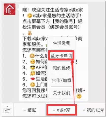 2. 关注后就会进入到e城e家廊坊本地生活公众号中,点下方菜单中间的“e城e家”,然后点击“蓝牙卡申请”