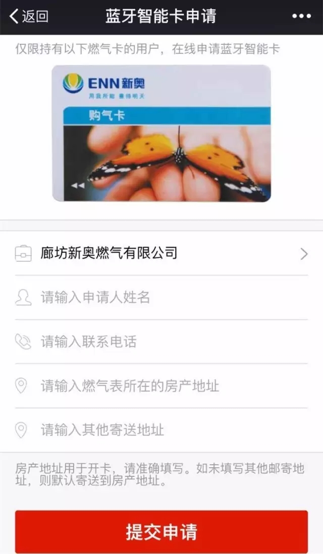 e城e家想的还算周到,他们专门做了个线上申请通道,在手机上填一下家里的地址、电话什么的就能预约了,预约成功之后,新奥e城e家会派专人把蓝牙卡直接送上门!