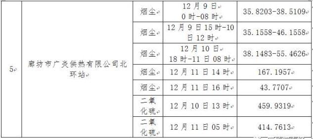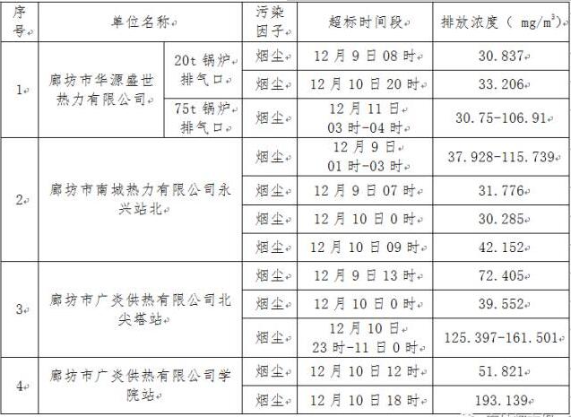 12月9日0时至11日16时廊坊恒盛供热有限公司、廊坊市汇源热力有限公司站和廊坊市开发区耀邦热力有限公司排放达标;廊坊市华源盛世热力有限公司、廊坊市南城热力有限公司永兴站北和廊坊市广炎供热有限公司3家公司5个热力站均超标排放。