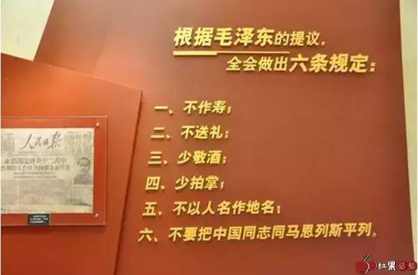 在西柏坡纪念馆内,有这样一块展板,上面写着“根据毛泽东的提议,全会作出六条规定:一、不做寿;二、不送礼;三、少敬酒;四、少拍掌;五、不以人名作地名;六、不要把中国同志同马恩列斯平列。”这是当年对中国共产党人定下的规矩。