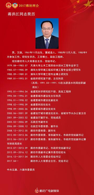 4月14日举行的廊坊市七届人大一次会议第四次全体会议,选举蒋洪江为市人大常委会主任,选举王俊臣、王相仁、陈洪波、王永威、邵二玲为市人大常委会副主任,选举毕忠庆为秘书长。