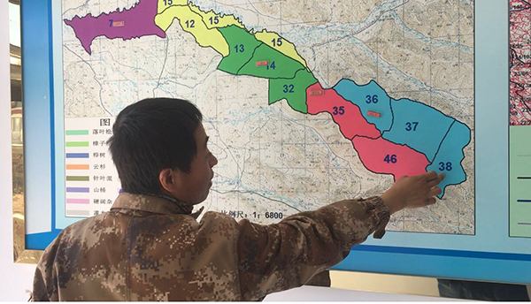 塞罕坝机械林场总场千层板林场烟子窑营林区施工员丁玉辉在驻地向澎湃新闻记者介绍林区分布。
