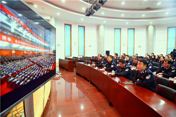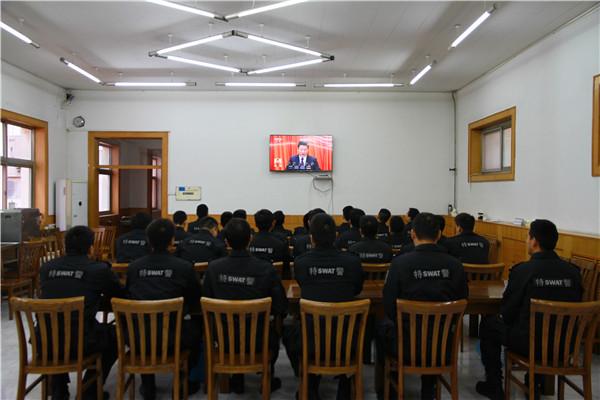 特警、治安、巡警、交警等各警种在保持正常值勤警力的情况下,积极组织备勤警力集中收听收看党的十九大开幕式实况。同志们满怀激情,广大公安民警纷纷表示:党的十九大的胜利召开,令人振奋,催人奋起,一定按照习总书记“对党忠诚、服务人民、执法公正、纪律严明”十六字重要指示为遵循,牢固树立“四个意识”,以无比坚定的决心、无比扎实的作风、无比严密的措施,再创新业绩,展示新形象,担当好人民公安的职责使命,不绝辜负党和人民的重托和期望,为社会稳定和经济建设保驾护航再鼓干劲,向党和人民再立新功。