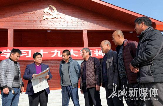 香河县庆功台村党总支书记范国生(左二)为村民解读十九大精神。王晓桐 摄