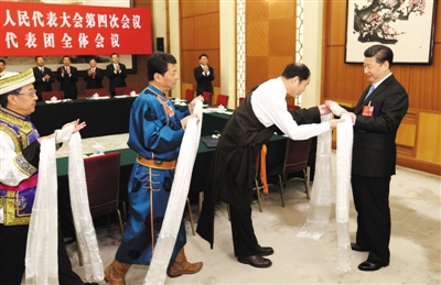 昨日上午,习近平参加了青海代表团的审议。当习近平来到会场时,3名来自藏族、蒙古族、土族的代表向总书记献上了洁白的哈达。