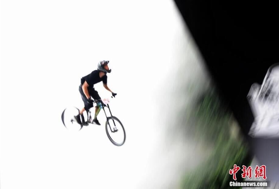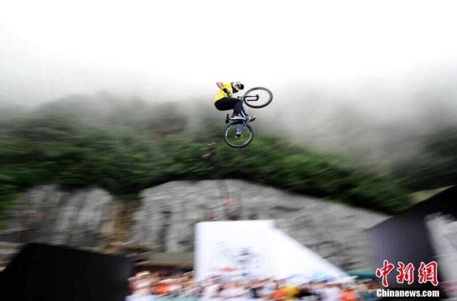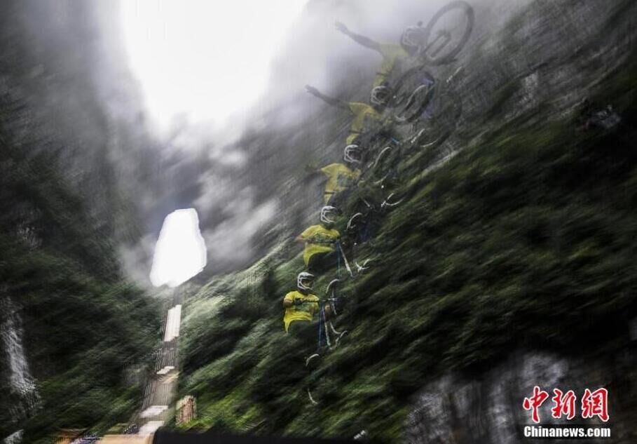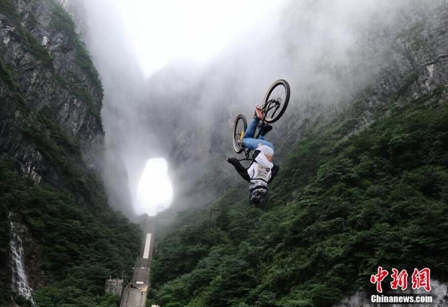 7月16日,第二届天梯速降赛在湖南张家界天门山举行,来自美国、加拿大、意大利等6个国家的13名国际顶尖自行车速降选手进行了第一天的技巧赛比拼,选手们骑着自行车在云雾中做出各种翻滚动作,犹如脚踩“筋斗云”。杨华峰 摄 图片来源:中国新闻网