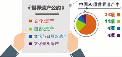 加入《公约》30多年来,中国积极开展遗产申报和保护,已成为世界遗产数量增长最快的国家之一。从2003年起,中国连续14年每年都有项目成功入选世界遗产名录。随着今年又有2个项目申遗成功,中国的世界遗产数量增至50项,其中,世界文化遗产35项(其中4项为文化景观遗产),世界自然遗产11项,文化与自然双重遗产4项。