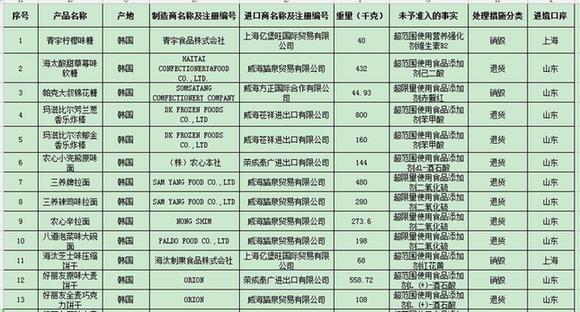 名单显示,21批未予准入的韩国食品存在超范围、超限量使用食品添加剂。其中,5批好丽友饼干被检出超范围使用食品添加剂L (+)-酒石酸,进口商涉及荣成泰广进出口有限公司(1批);1批乐天巧克力打糕被检出超限量使用食品添加剂二氧化硫,进口商为威海踏泉贸易有限公司。