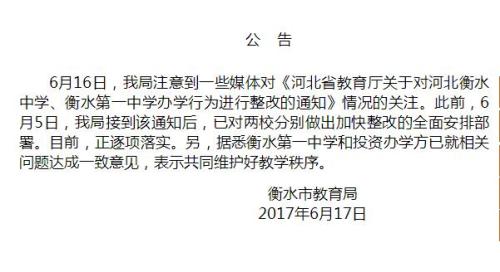 衡水市教育局公告表示,已对两校分别做出加快整改的全面安排部署。目前,正逐项落实。另外,据悉衡水第一中学和投资办学方已就相关问题达成一致意见,表示共同维护好教学秩序。