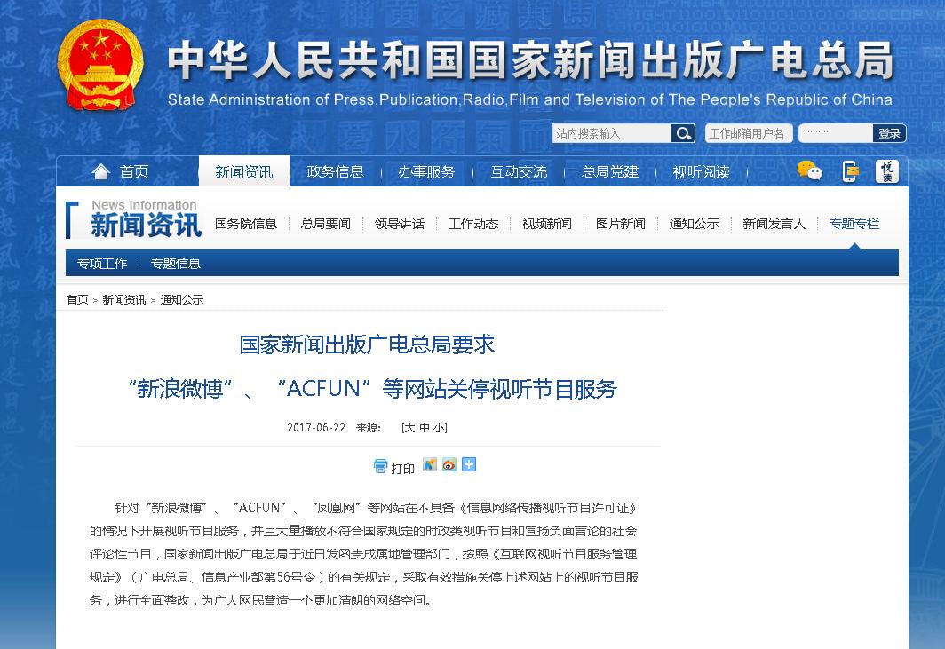 央视网消息:据国家新闻出版广电总局网站消息,针对“新浪微博”、“ACFUN”、“凤凰网”等网站在不具备《信息网络传播视听节目许可证》的情况下开展视听节目服务,并且大量播放不符合国家规定的时政类视听节目和宣扬负面言论的社会评论性节目,国家新闻出版广电总局于近日发函责成属地管理部门,按照《互联网视听节目服务管理规定》(广电总局、信息产业部第56号令)的有关规定,采取有效措施关停上述网站上的视听节目服务,进行全面整改,为广大网民营造一个更加清朗的网络空间。