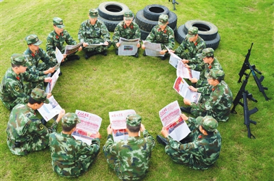 武警广西总队来宾市支队忻城县中队官兵认真组织学习党的十九大精神。