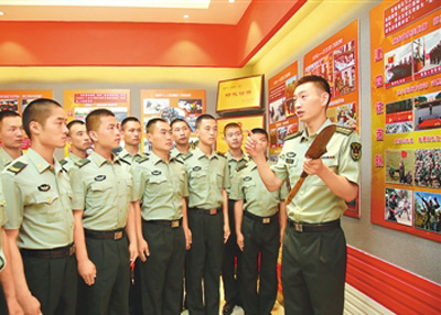 陆军某部“大功三连”指导员(右一)在连队荣誉室为战士们讲传统故事。
