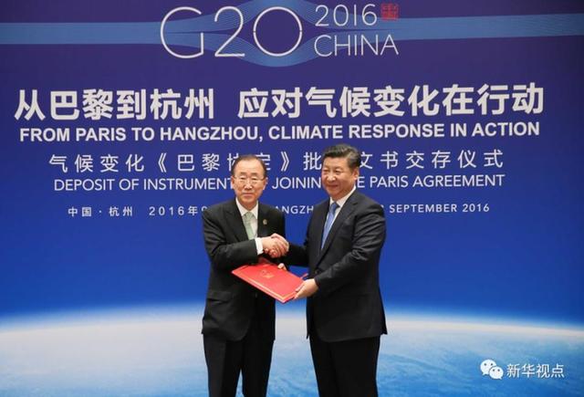 ↑2016年9月3日,习近平向潘基文交存中国气候变化《巴黎协定》批准文书