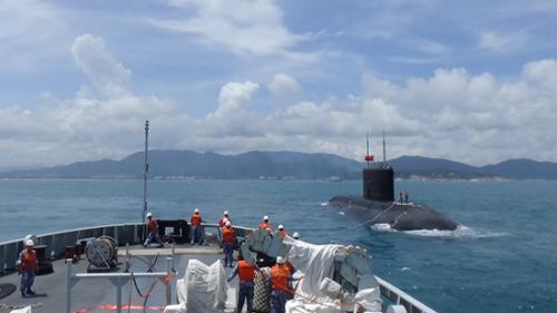 在艇员安全转移出潜艇后,4名潜水员在专用设备协助下,在潜艇专用接口处接上供气软管,并打开水柜截止阀,然后由救生船空气系统提供气源。随后,充气完成的潜艇开始慢慢上浮。某型拖船快速占领拖带位置,调整航向航速,对上浮潜艇实施拖带。