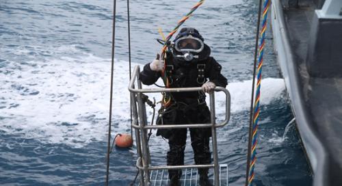 潜水员准备下水对“失事潜艇”进行探摸等作业