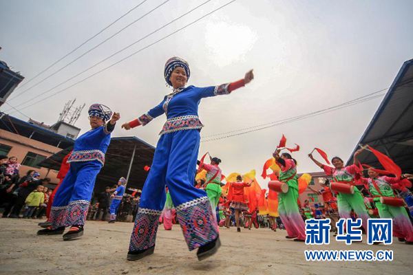 2月15日,在湖南省湘西土家族苗族自治州龙山县靛房镇燎原社区,人们载歌载舞,欢欢喜喜迎新春