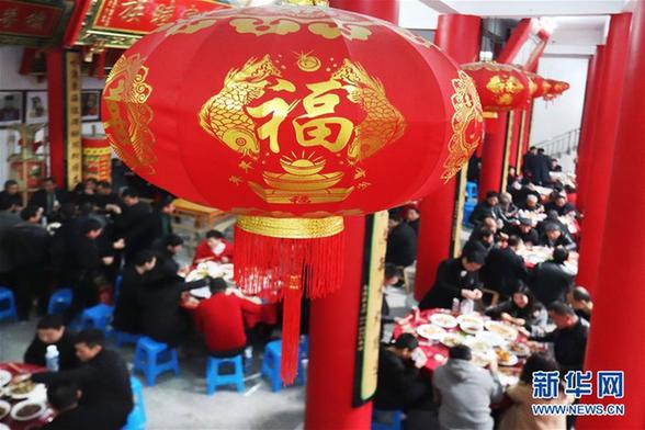 2月17日,在浙江省温州市苍南县苏家店村,村民欢聚一堂品佳肴、话家常。大年初二,浙江省温州市苍南县苏家店村村民在村文化活动中心团圆聚餐,共叙邻里情,欢度新春佳节