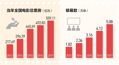 2018年春节长假期间,全国电影票房创下历史同期新高,除夕至正月初六,全国总票房达57.2亿元,较去年同期增长66.9%。2017年全国电影总票房达559.11亿元,较上年同期增长13.45%。