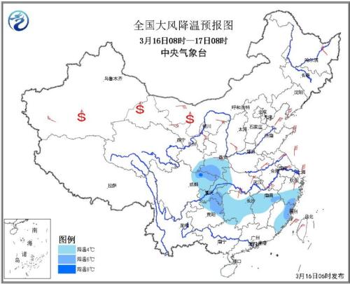 中央气象台3月16日06时继续发布寒潮蓝色预警:受冷空气影响,预计16日,陕西南部、湖北西部、西南地区东部、江南中部和东南部等地气温将下降4~6℃,部分地区降温幅度可达8℃。日最低气温0℃线将位于黄淮东部、华北南部等地。