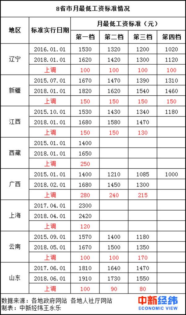 公开资料显示,除上述8省市外,如相关政策无调整,广东、四川、安徽最低工资标准也将在2018年上调。